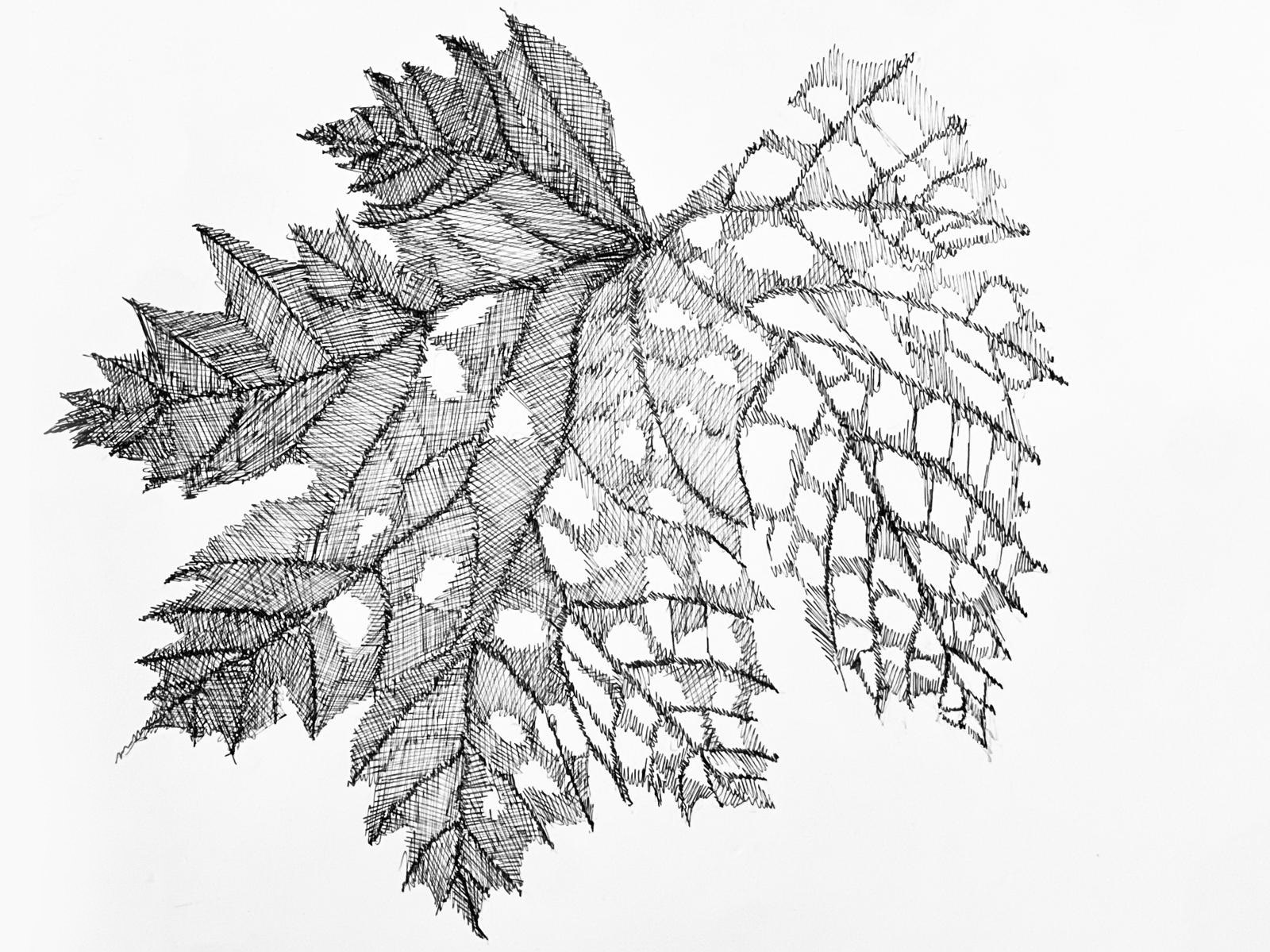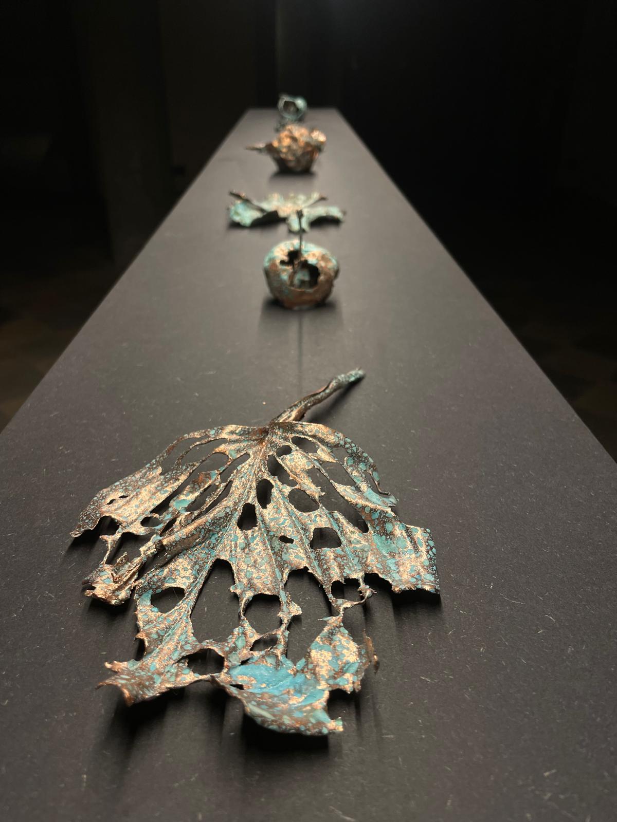 A completare l’installazione allestita nella penombra come a evocare un laboratorio scientifico, una serie di disegni realizzati a inchiostro che ritraggono i tre tra i principali insetti che affliggono le culture vitivinicole: la Popilia Japonica, il Sigaraio della vite, la Cicalina della flavescenza dorata. Ognuno di questi insetti è accostato alla foglia di vite che segnata dal loro passaggio, assume forme sempre diverse che, come per le sculture, prendono un valore simbolico e visivo.